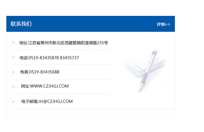 傳真:0519-83435688    郵編:213135    網址:WWW.czjhgj_com.717jk.com    電子郵箱:JH@czjhgj_com.717jk.com